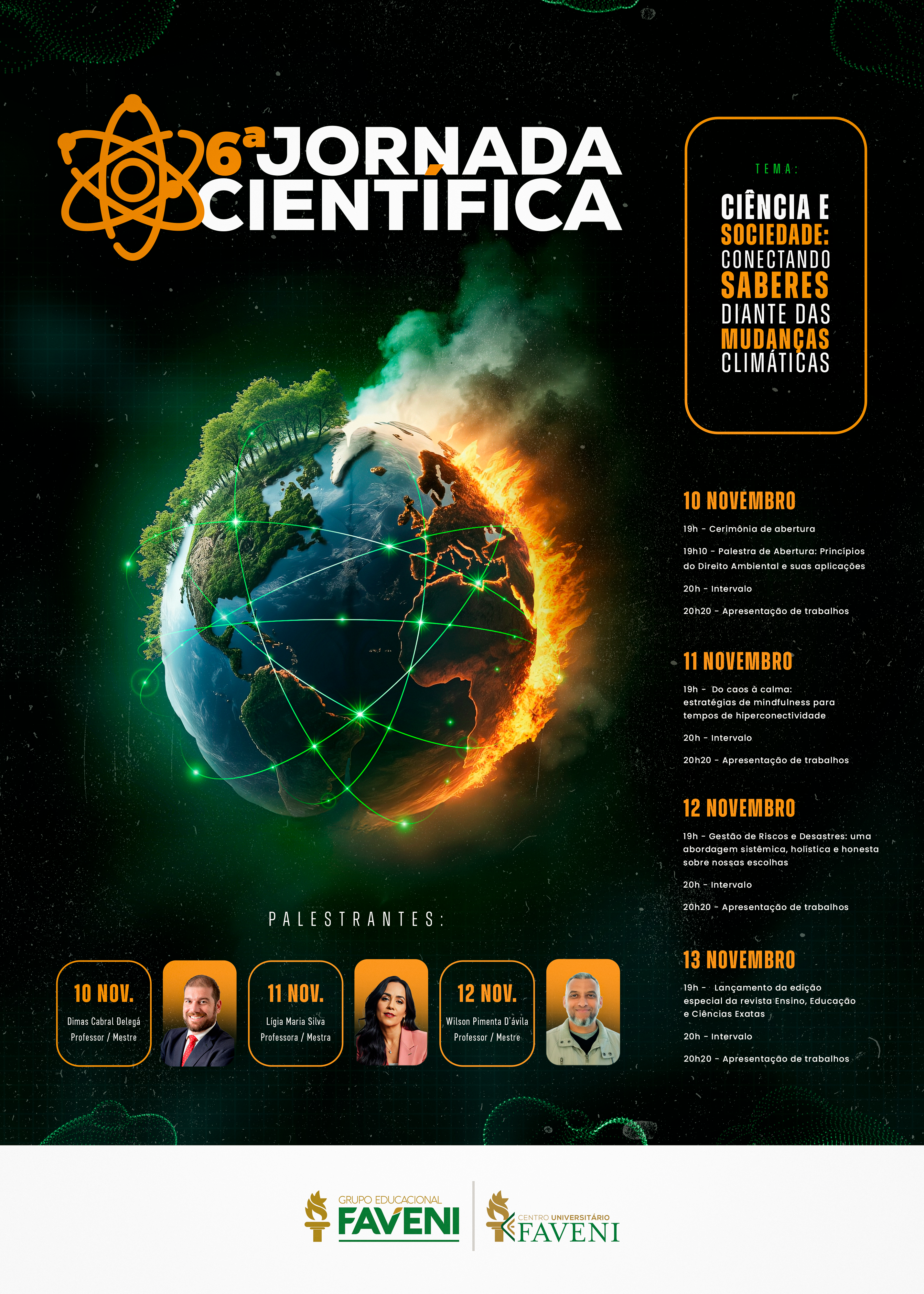 Alinhado à 22ª Semana Nacional de Ciência e Tecnologia cujo tema nacional é “Planeta Água: a cultura oceânica para enfrentar as mudanças climáticas no meu território”, o tema de nossa VI Jornada Científica valoriza a interação entre ciência, cultura e comunidade para construir soluções frente à crise climática.A JORNADA CIENTÍFICA DO GRUPO EDUCACIONAL FAVENI é um evento acadêmico, totalmente on-line e gratuito, ofertado pelo GRUPO EDUCACIONAL FAVENI, voltado para estudantes de Graduação e Pós-Graduação. O evento será composto por apresentação de palestras e apresentação de trabalhos científicos em formato oral e em e-pôster.